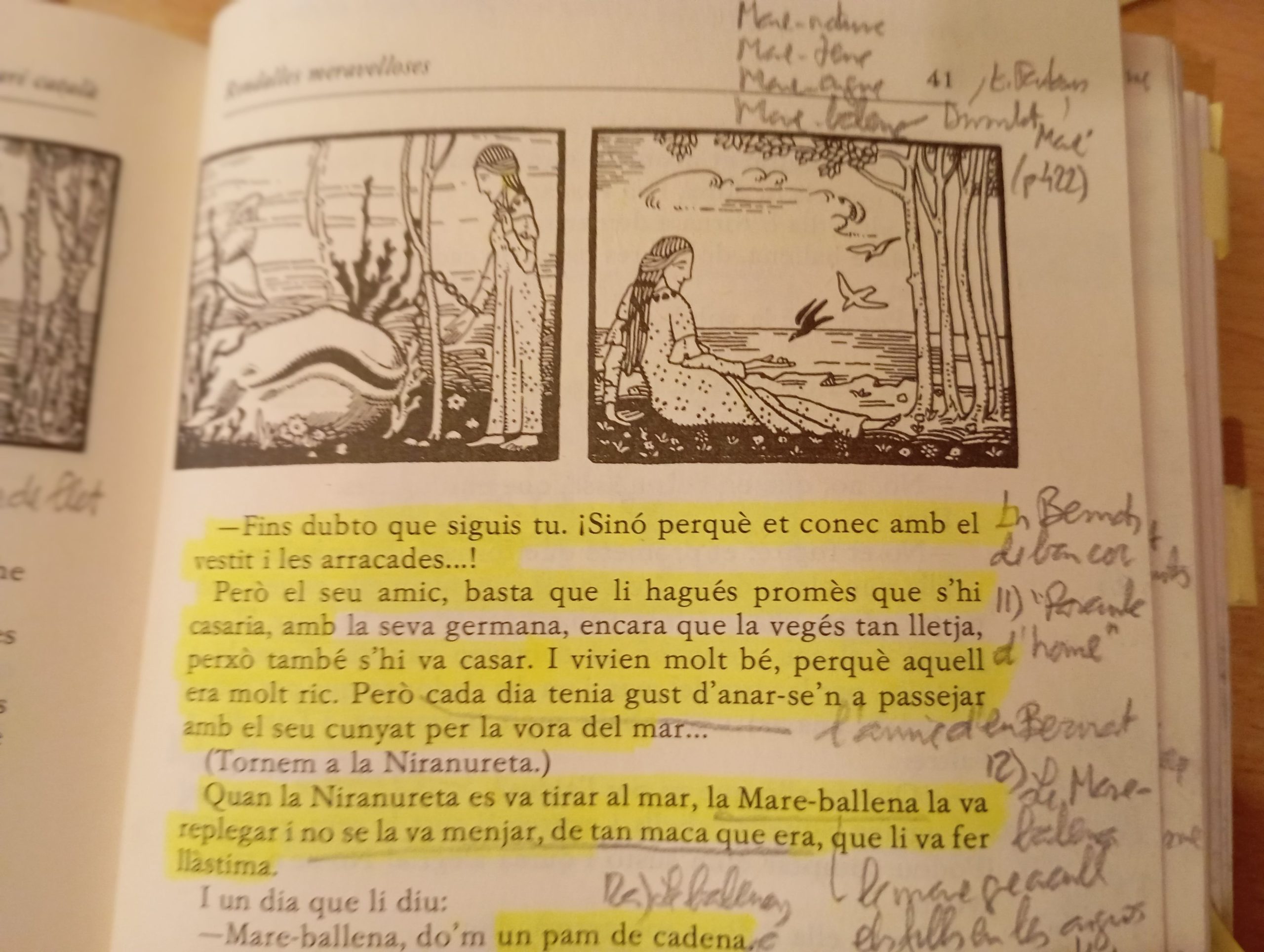 Té passatges que recorden llegendes en què s’explica el part i el paper de la comare”, “No. Ens explicaven la vida de les sirenes, que estan, tantíssimes, enamorades de la mar, que noi que no les estimés, a la fi, el deixaven sol.